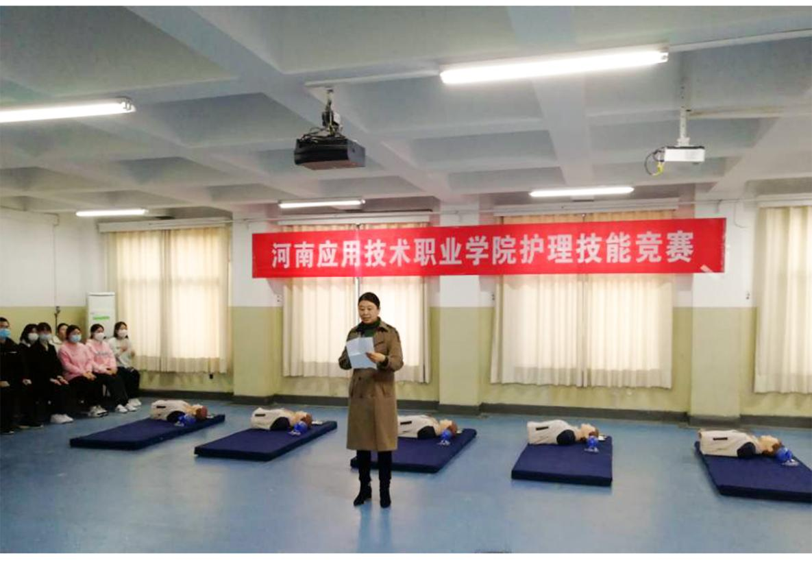 河南应用技术职业学院第七届护理技能竞赛于2021年11月25日下午17:00在1号实训楼(D楼)207举行,护理学院王风云院长致辞,通过真实事例为同学们科普掌握心肺复苏的重要性并对此次参加比赛的选手表示殷切的期望。此次比赛项目为心肺复苏术,参赛选手分为医护专业组(护理、助产专业)43名和非医护专业组(空乘专业)10名。