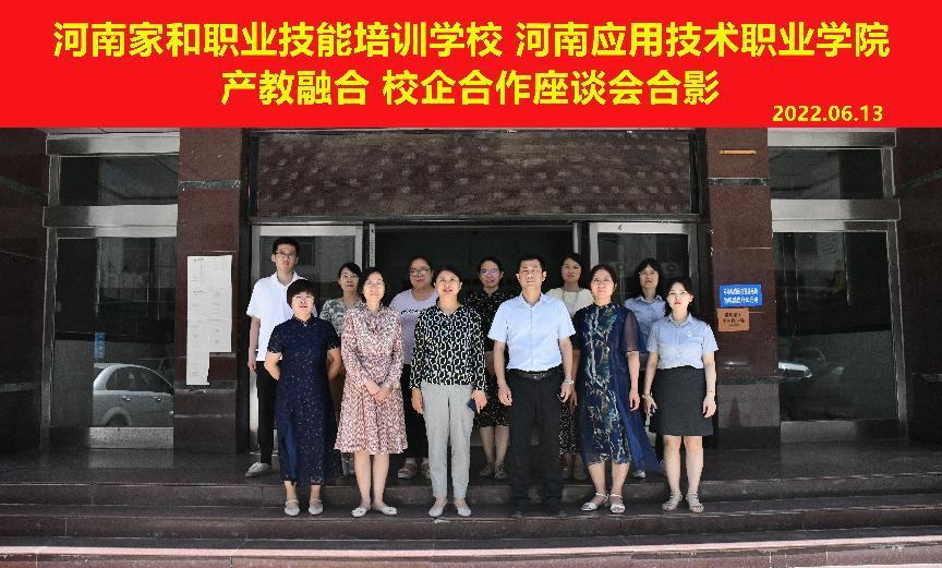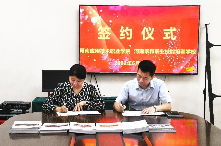 6月13日上午,河南应用技术职业学院护理学院和河南家和职业技能培训学校有限公司共同签署了“高质量技能人才联合培训校企合作”协议书,河南应用技术职业学院护理学院院长王风云、副院长陈永惠及各教研室主任与河南家和职业技能培训学校有限公司校长欧翔宇、副校长初英、李心蕾、徐凤香、教务主任高雪共同出席了签约仪式。