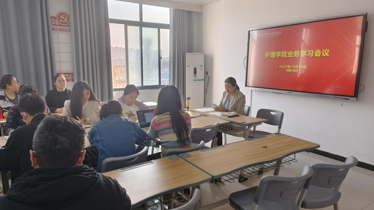 根据学校有关安排,2023年10月10日,护理学院组织全体专兼职教师在A515党员活动室进行业务学习活动,集中学习了“习近平致信全国优秀教师代表强调大力弘扬教育家精神,为强国建设民族复兴伟业作出新的更大贡献,向全国广大教师和教育工作者致以节日问候和诚挚祝福”以及《高等学校实验室消防安全管理规范》,对教育部公开曝光第十三批7起违反教师职业行为十项准则典型案例进行了警示教育学习,并组织研讨《河南应用技术职业学院教材管理办法(2023年修订版)征求意见稿》。会议由护理学院院长王风云主持。