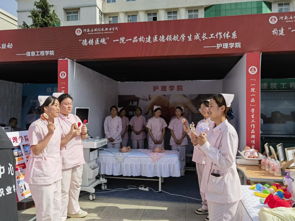 为全面贯彻落实党的二十大精神,在教育强国建设中开创职业教育新局面、塑造新赛道,2024年5月13日河南应用技术职业学院2024年职业教育活动周中护理学院开展“德铸医魂”一院一品构建医德领航学生成长工作体系活动。