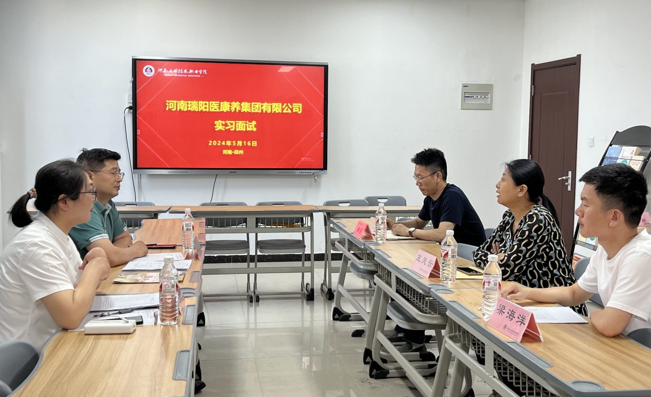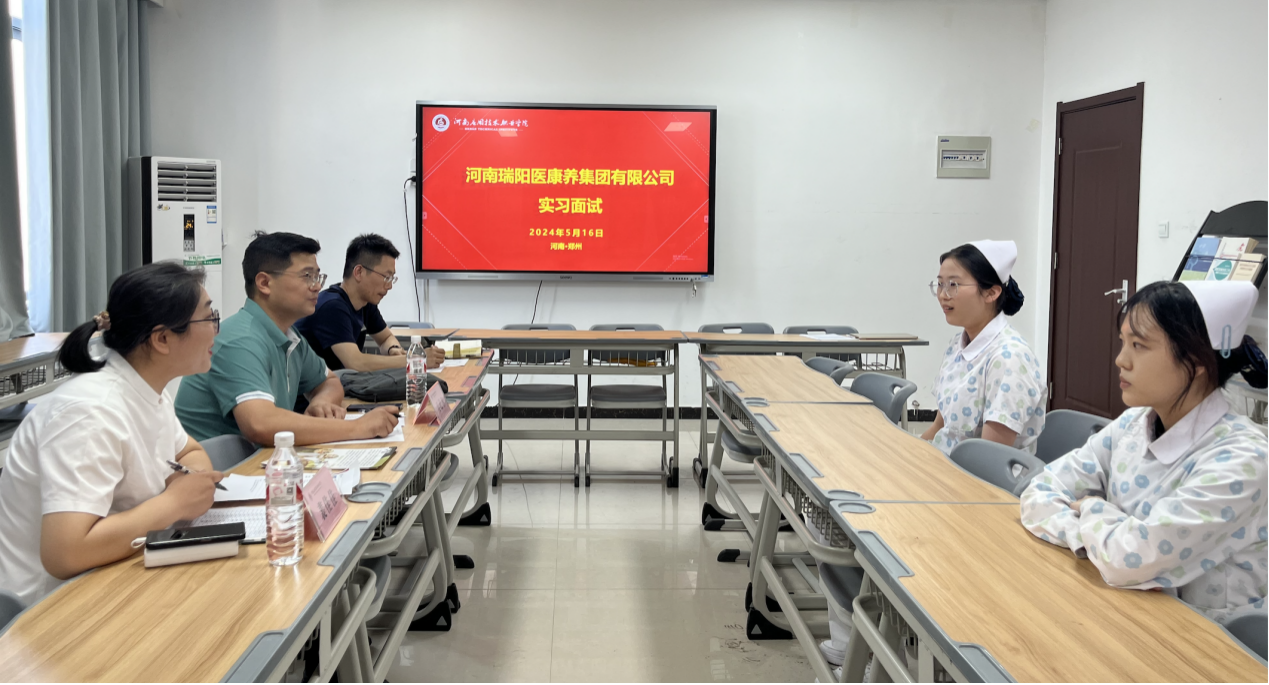 2024年5月16日下午,河南瑞阳医康养集团代表一行来到河南应用技术职业学院郑州校区,对护理学院老年保健与管理专业的同学们进行了实习面试。此次面试旨在选拔优秀实习生,为他们提供实践与学习的机会,同时进一步加强校企合作,共同培养适应社会需求的医学康养人才。