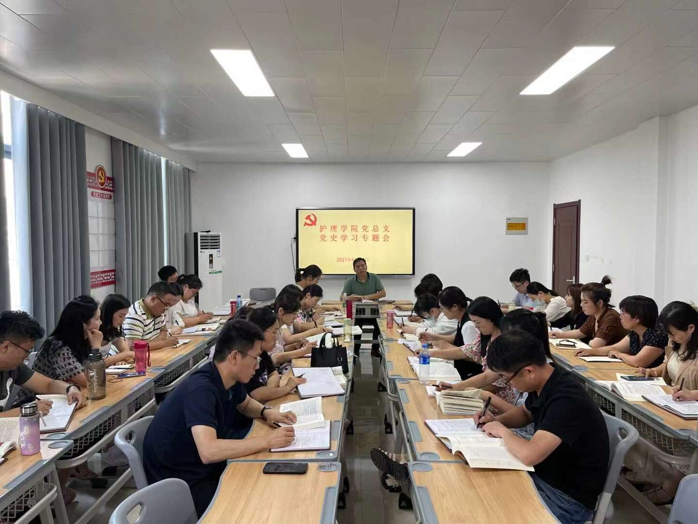 根据学校党史学习教育实施方案,2021年6月22日下午,护理学院党总支组织全体教师在A515党员活动室召开党史学习专题会,集中学习讨论《中国共产党简史》中“中国特色社会主义进入新时代”,会议由护理学院党总支书记杨明杰主持。