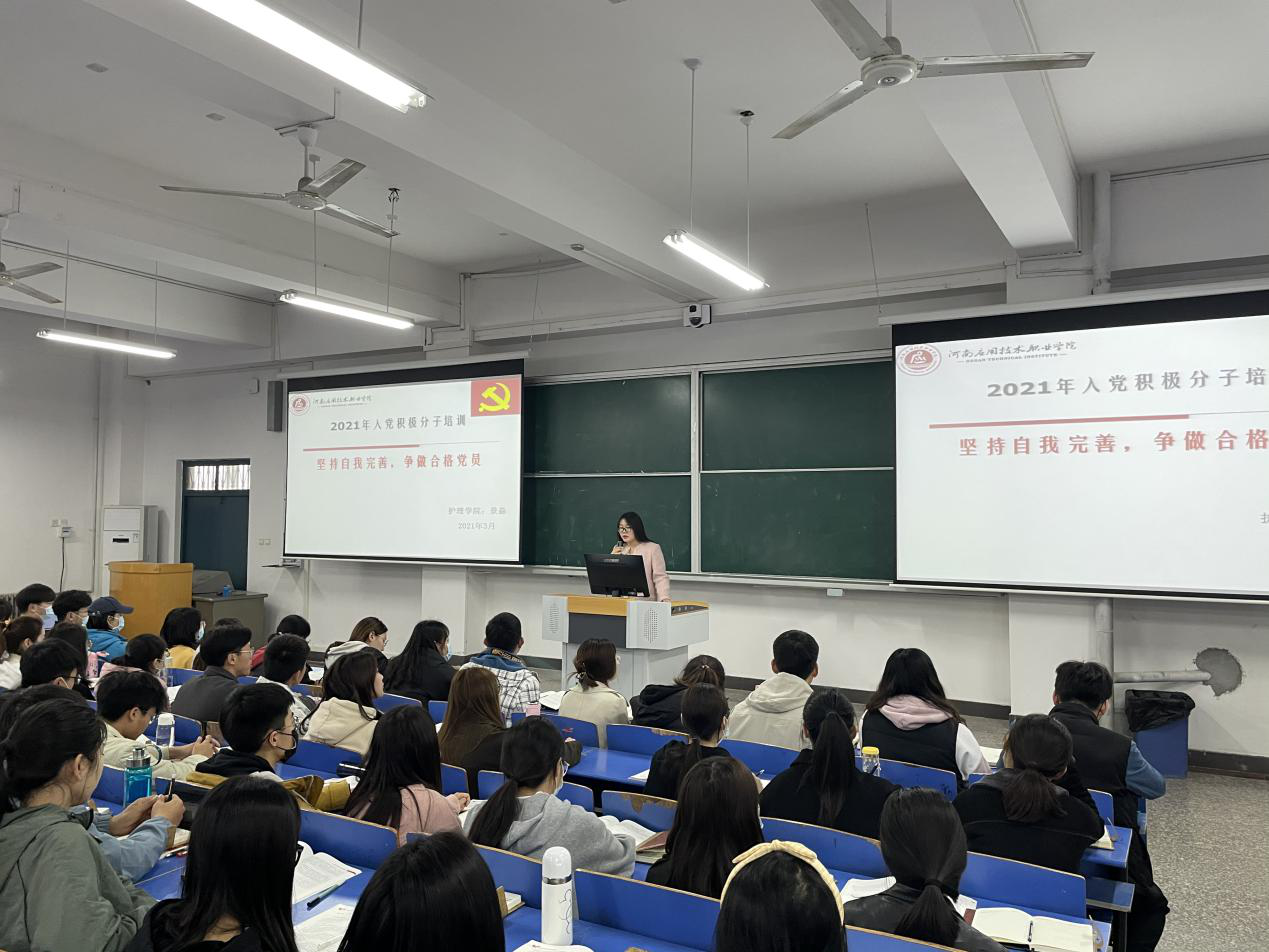 2021年3月13日上午,护理学院党总支组织委员景淼同志结合大学生实际情况,以《坚持自我完善 争做合格党员》为主题,在B楼201教室为108名积极分子讲授专题党课。