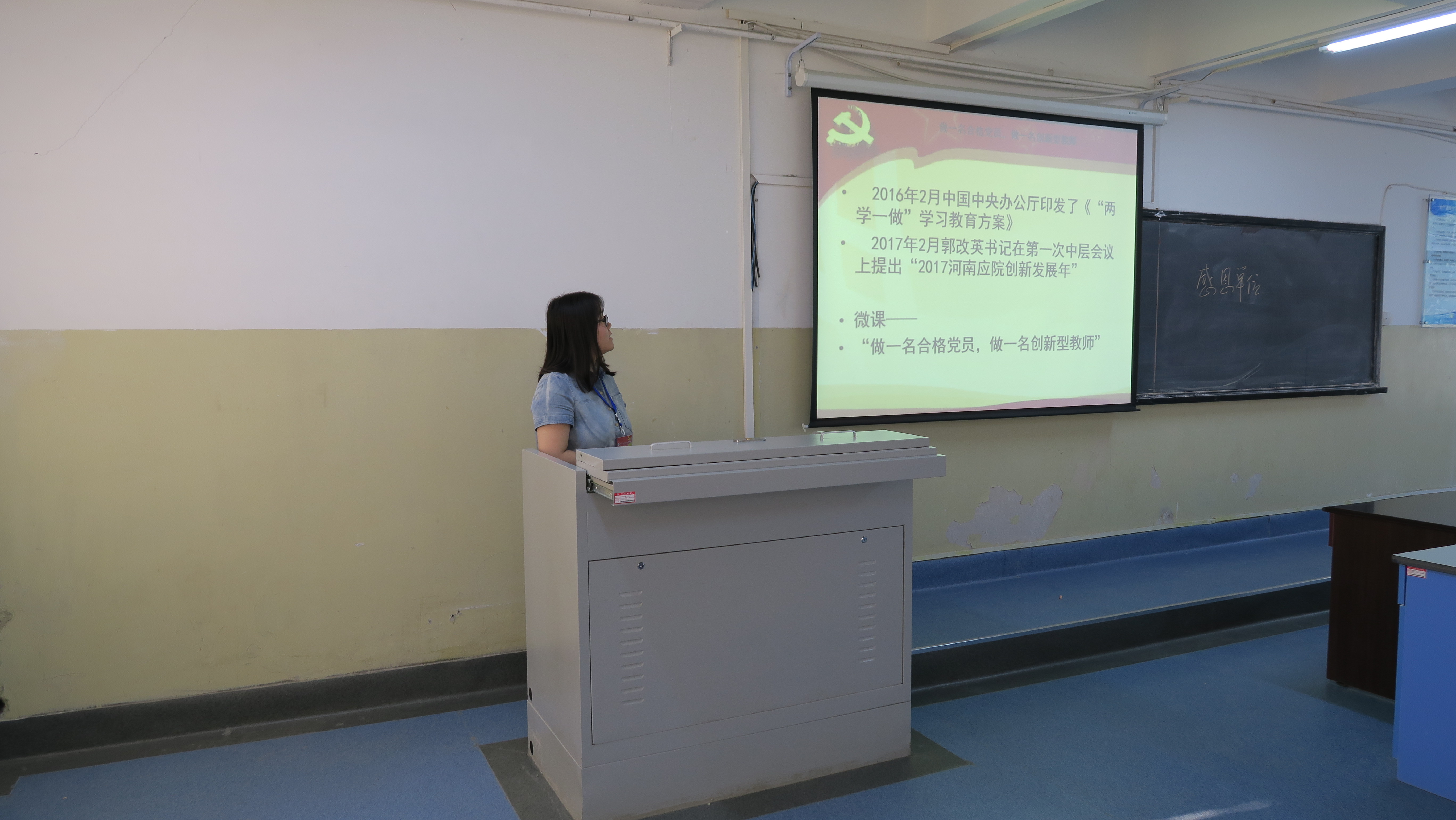 2016年2月中共中央办公厅发出《两学一做》学习教育方案,各地区各部门认真贯彻执行;2017年2月郭改英书记在第一次中层会议上提出2017为2026世界杯创新发展年,景淼同志以“做合格党员,做创新型教师”为授课主题。