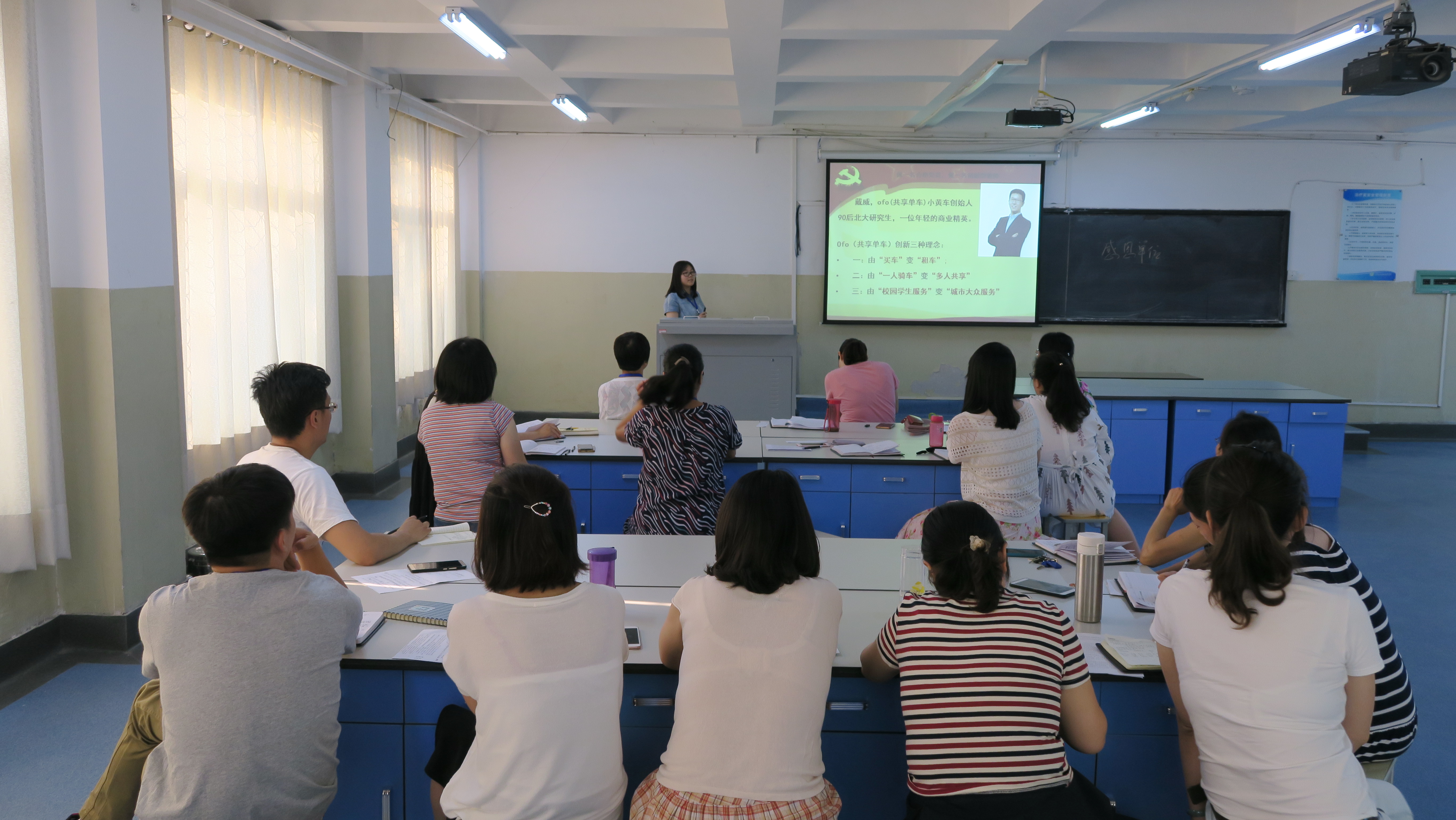 授课中以目前郑州最热的小黄车ofo为切入点,提出创新的重要性,就护理学院学生党支部和自身而言归纳了四创:一创:党支部学习方式由“一人讲”变“人人讲”;二创:“特色服务”走进校园走向社会;三创:党课由“大篇幅”变“微党课”;四创:教学中由“抽象”变“具体”。