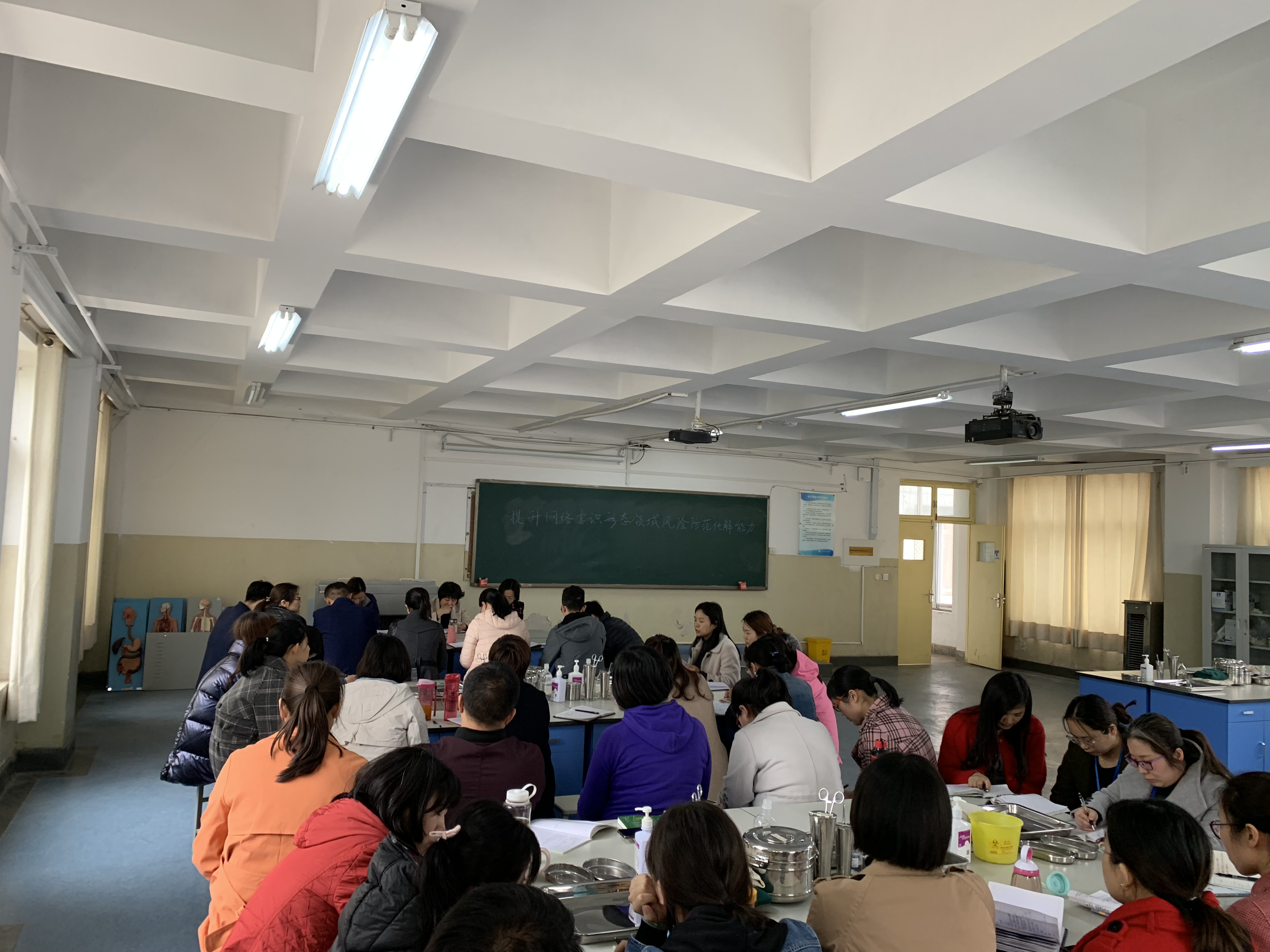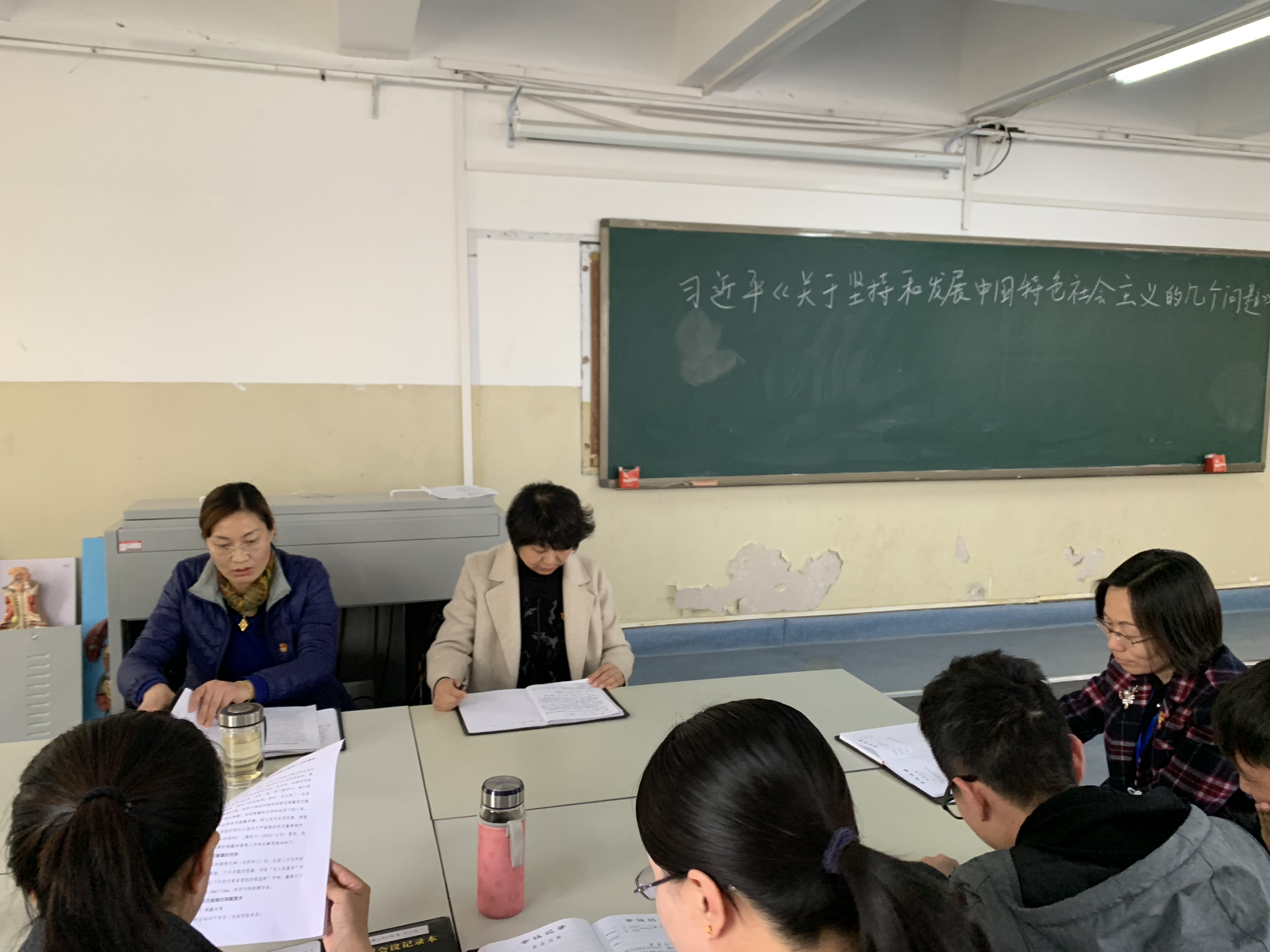 2019年4月9日下午,护理学院全体教职工在D207召开会议,重点学习了《关于坚持和发展中国特色社会主义的几个问题》和《提升网络意识形态领域风险防范化解能力》。徐娟书记指出要认真学习领会习近平总书记重要讲话精神,领会习近平总书记提出的要求,深刻把握其中内涵,体会贯穿其中的坚定信仰和增强网络忧患意识,提高防控能力。