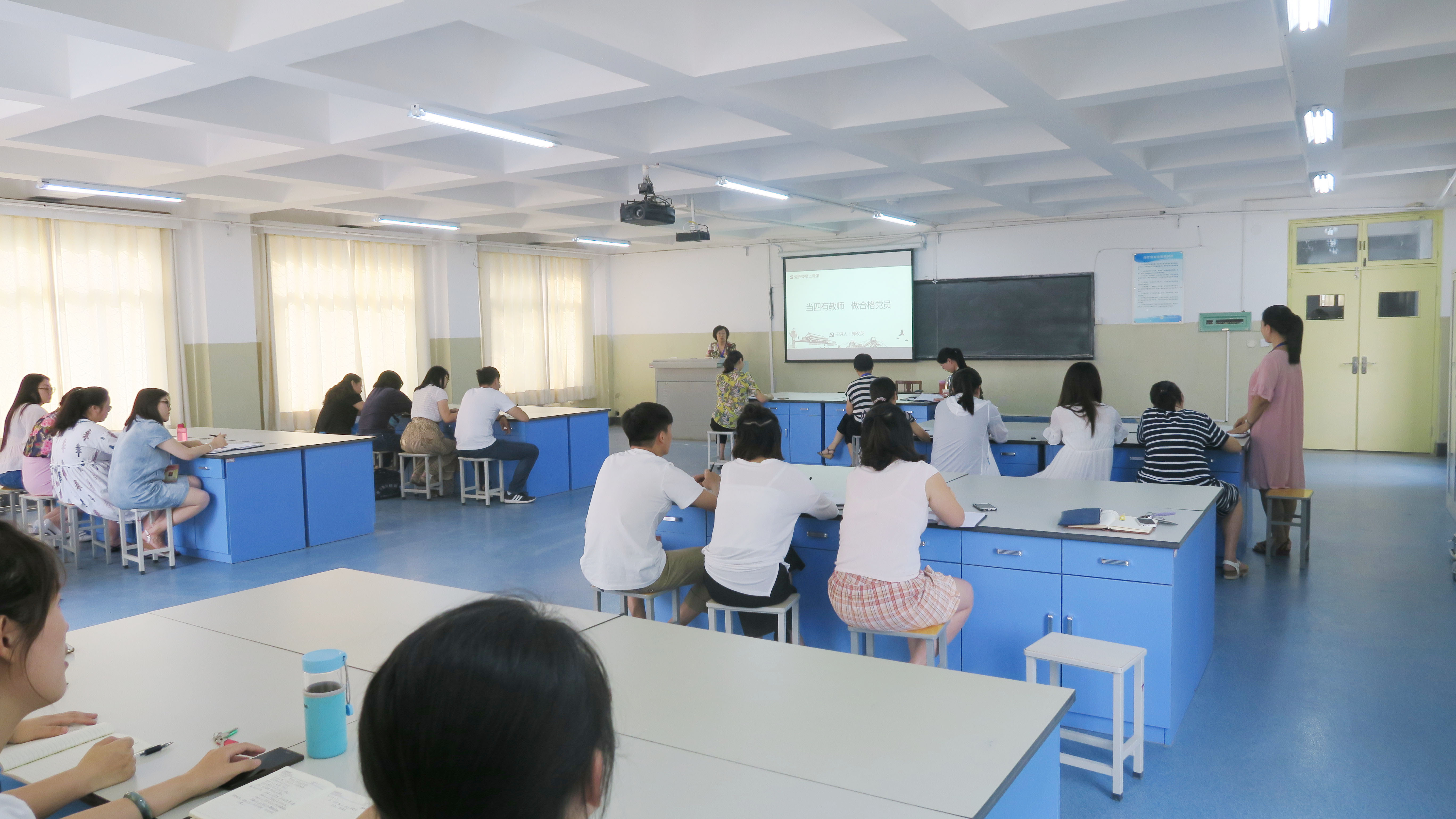 会上,郭改英以“当四有教师 做合格党员”为题进行党课宣讲。她首先强调了什么是“四有”教师,并以习近平总书记强调的“有理想信念、道德情操、扎实学识、仁爱之心”的“四有好老师”标准提出要严格落实在教师岗位工作上,进而围绕如何做优秀的党员教师提出四点意见:一是提升政治底气,坚定理想信念;二是遵循规矩纪律,树立师德师风;三是潜心学习钻研,掌握扎实学识;四是热爱学生教学,传播仁爱之心。