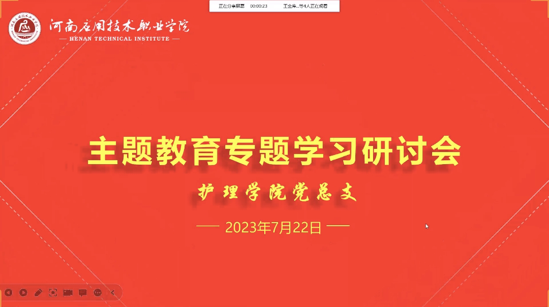 为深入开展学习贯彻习近平新时代中国特色社会主义思想主题教育,根据学校有关安排,2023年7月22日,护理学院党总支组织全体教职工在线上召开主题教育专题学习研讨会,会议由护理学院党总支书记杨明杰主持。