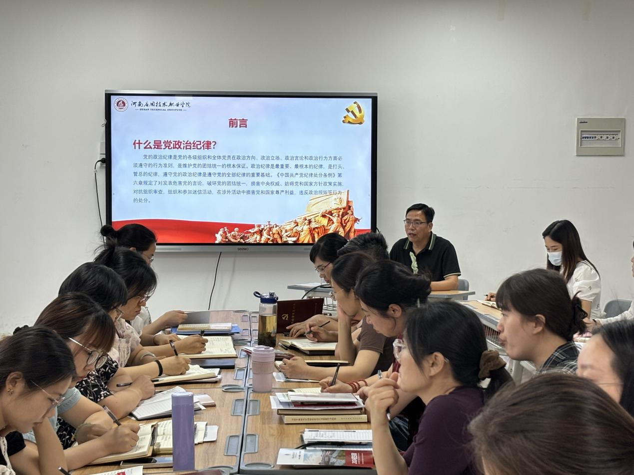 根据学院有关工作安排,2024年5月28日,护理学院党总支书记杨明杰以《党的政治纪律》为题在A515党员活动室为护理学院全体教职工讲授专题党课。