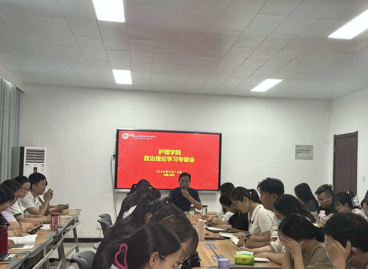 为深入学习贯彻习近平总书记重要讲话和重要指示精神,提升我院教职工的政治理论素养,6月18日,护理学院在A515党员活动室组织全体教职工开展政治理论学习,会议由护理学院党总支书记杨明杰主持,全体教职工参加。