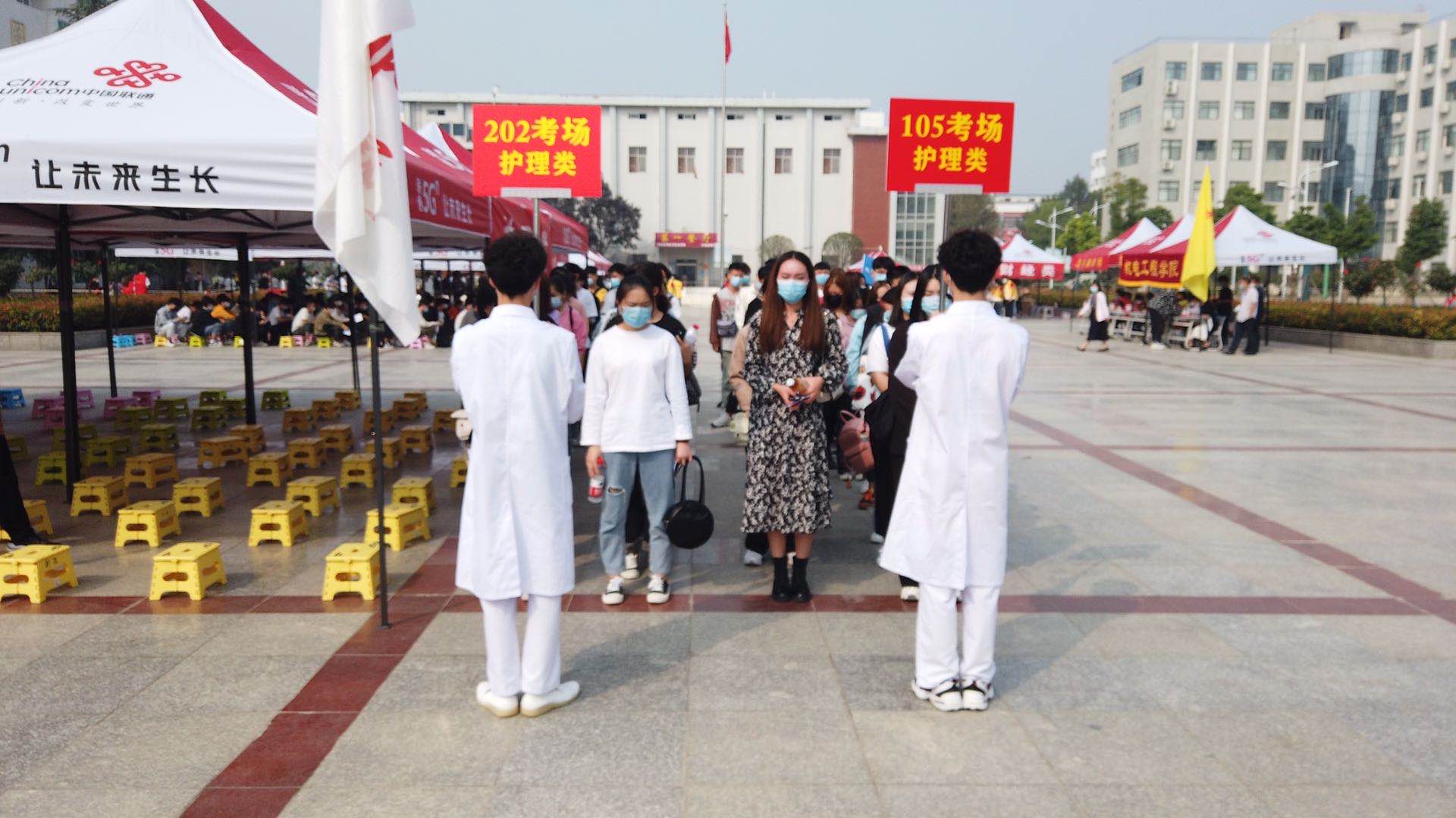 考试当天,在护理学院徐娟书记,王风云院长,陈永惠院长的带领下,以及各位老师和团学会学生干部的积极配合下,组织考生依次按要求进行身份核查,并沿指示路线前往考场进行考试。入校考生均全程佩戴口罩,同时在护理学院候考区设置临时观察点,在严抓考风考纪的同时,确保每一位考生的安全,做到考试与防疫两不误。当日在考试现场,考生们沉着应考,监考老师严肃负责,在各位老师和学生干部的协调配合下,本次单招考试工作井然有序的顺利完成。