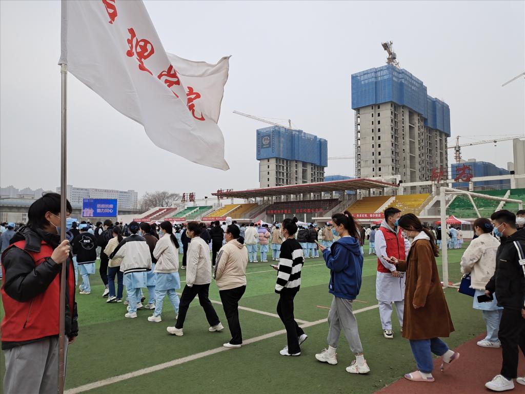 护理学院志愿者积极组织、维持核酸检测工作秩序,学生以班级为单位,错时错峰,一人一码,间隔一米。