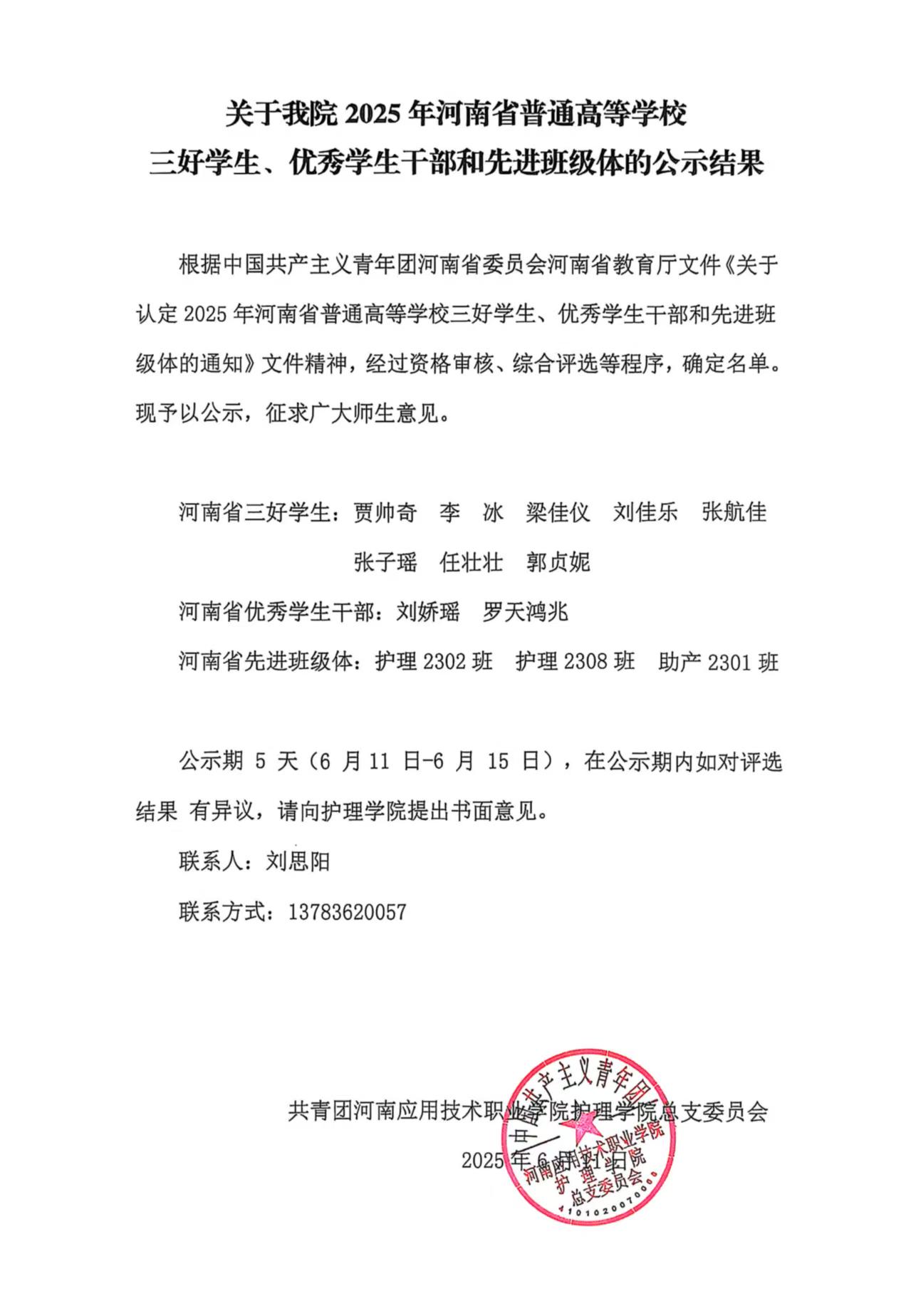 关于我院2025年河南省普通高等学校三好学生、优秀学生干部和先进班级体的公示结果