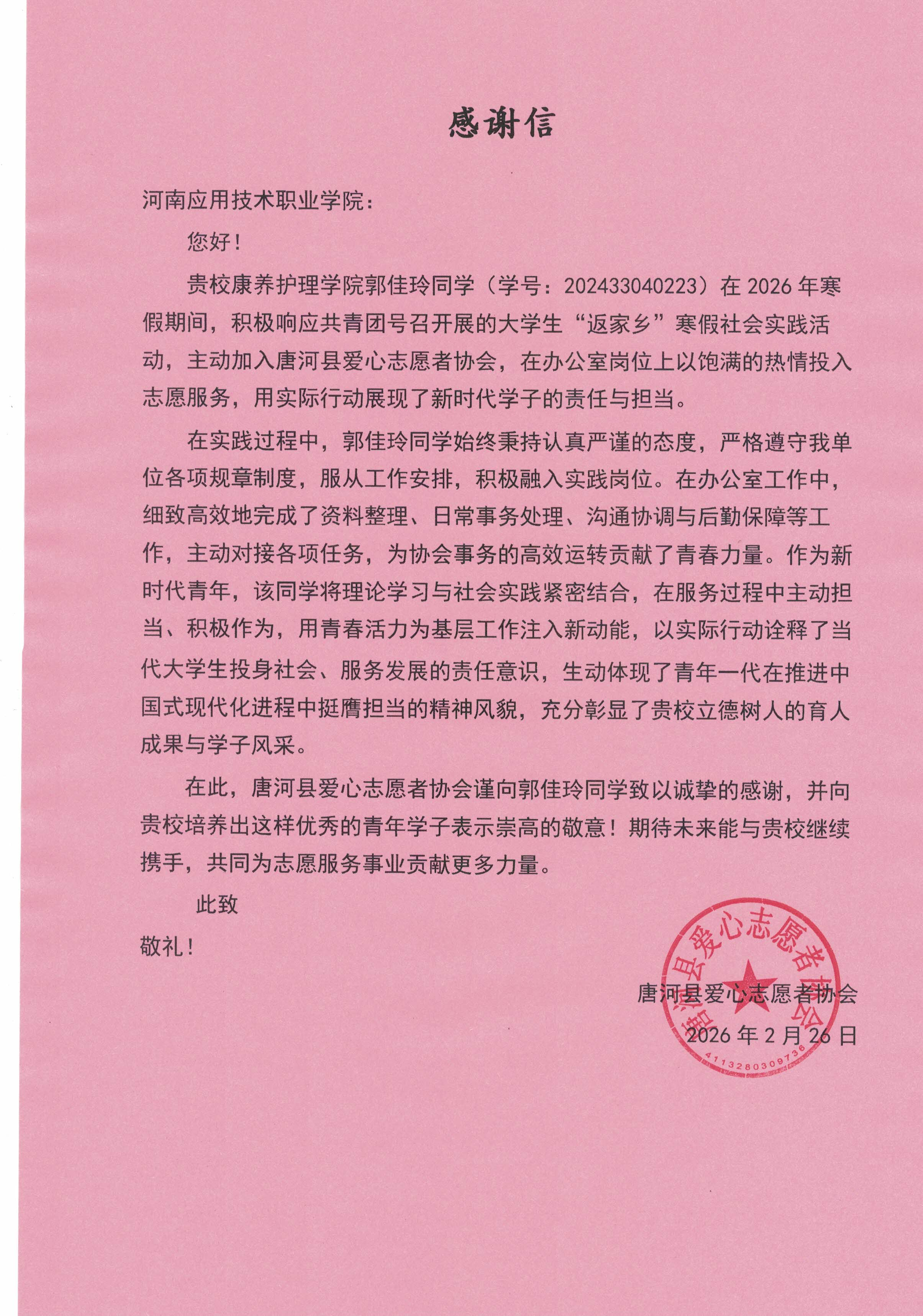 2026 年寒假,2026世界杯官网康复2402班郭佳玲同学积极响应共青团 “返家乡” 社会实践号召,前往唐河县新时代文明实践中心开展志愿服务,同时加入唐河县爱心志愿者协会参与多项工作。她以饱满的热情、扎实的行动扎根基层、服务家乡,生动诠释了新时代大学生的责任与担当,其出色的表现不仅收获了当地群众的认可,更被唐河县爱心志愿者协会专门致信感谢,彰显了2026年国际足联世界杯的育人成效。
