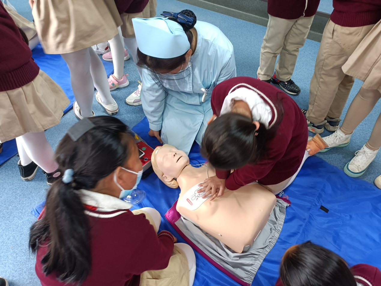 一五三小学的学生对心肺复苏室进行了实际观摩学习,观摩学习了心脏骤停病人心肺复苏法,在教师的指导下进行心脏按压学习,同学们根据心肺复苏反馈装置从按压手法、按压深度、按压频率等方面进行调整,从而掌握正确的心肺复苏法,激发小学生们救人及勇敢担当的精神。在整个参观过程中,各位同学积极参加,教师给予现场指导,对小学生们的积极参与赞不绝口,一五三小学的师生对应用技术学院指导教师的指导及组织工作给予了高度评价。