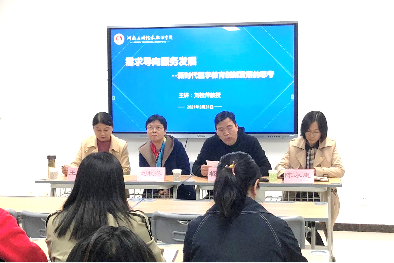 2021年3月31日晚,护理学院在A515党员活动室举办了主题讲座。此次讲座由护理学院杨明杰书记主持,邀请了河南省护理教育教学指导委员会委员,河南省医学教育研究会秘书长,河南省郑州大学护理学院教授,硕士生导师刘桂萍教授主讲,护理学院全体教师参与聆听讲座,讲座题目为:需求导向 服务发展--新时代医学教育创新发展的思考。