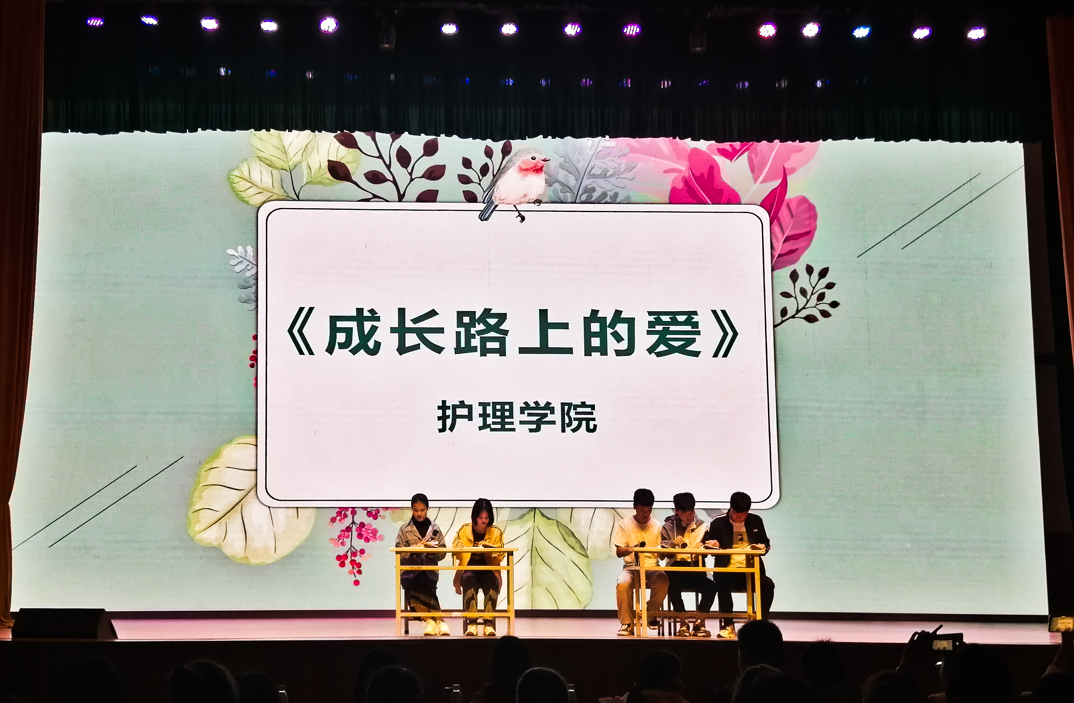 在本次心理剧大赛中,护理学院赵千老师与参赛选手共同排练,认真探讨剧中人物的心理活动,尽可能真实的表现出人物的所思所想。心理剧参赛剧目——《成长路上的爱》,以校园发生的真实故事为原型,自编自演,在演出中大胆运用了旁白、独白、黑白替身等心理技术来刻画人物心理,揭示了校园中同学之间的相互理解、关心,展现了大学生涯中浓浓的同窗之谊,用真实情感讲述了师生之间可圈可点的感人的青春故事,紧张的气氛牵动着观众们的情绪,引起在场观众的强烈共鸣,赢得了评委们的赞许和掌声。心理健康是学生未来发展重要的核心素养,希望通过开展系列的心理健康教育,帮助学生拥有积极向上的心理品质,为今后的人生打好明亮的底色。此次校园心理剧大赛中,护理学院选手表现优异,用精湛的演技为护理学院赢得了校园心理剧大赛二等奖。