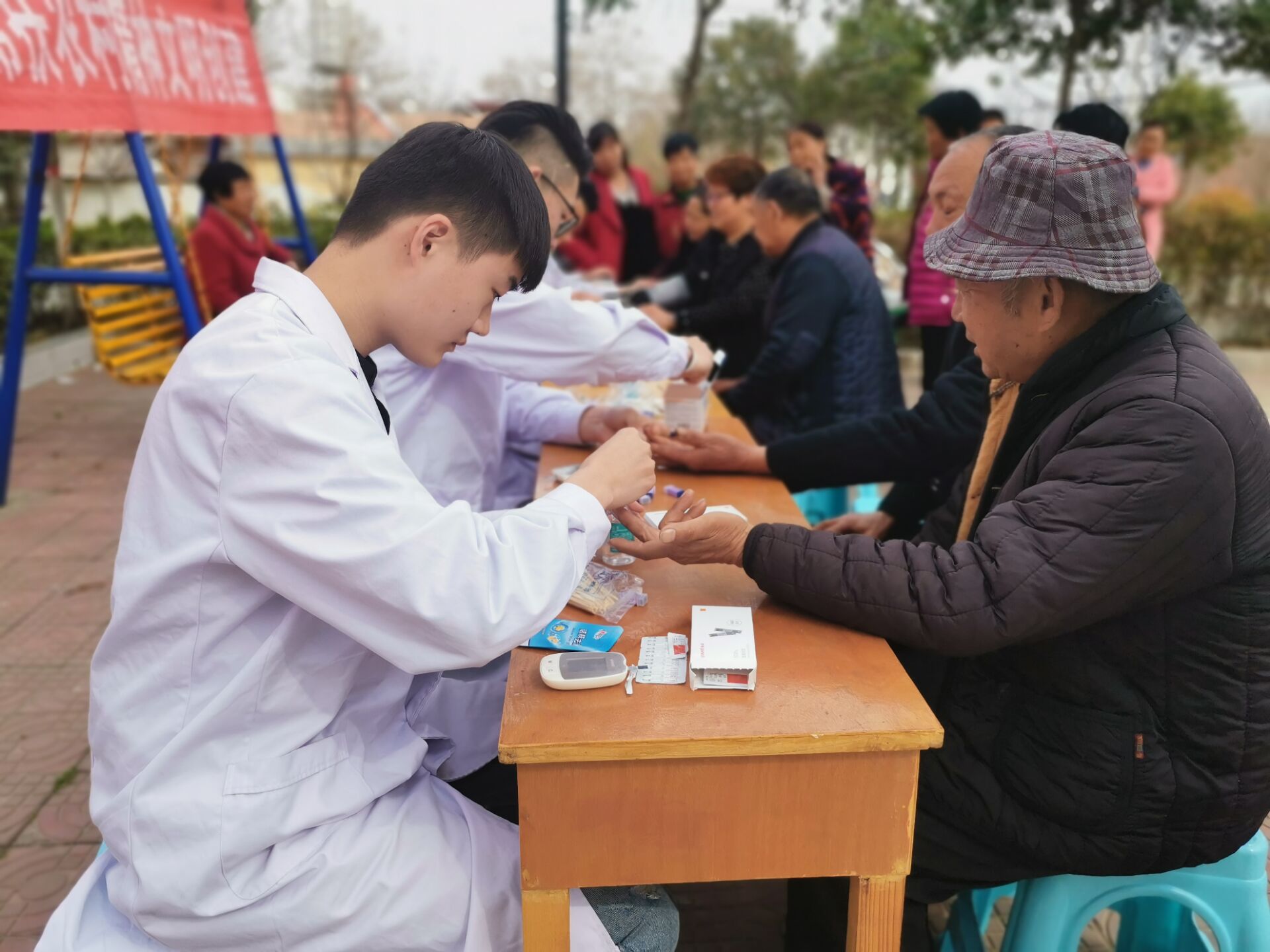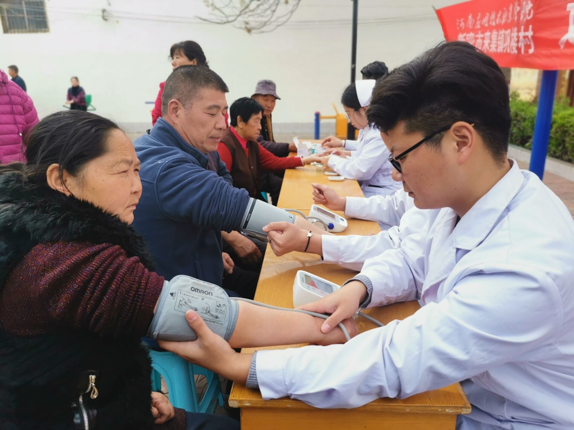 三月,是文明礼貌月,是学习雷锋精神月。为纪念雷锋同志,传承雷锋精神,发挥高校师生的专业优势,推动志愿服务事业实现新发展,向社会普及医疗健康知识,提高居民防病治病常识,在2019年3月22日中午,护理学院志愿者随学校宣传部来到了新密市来集镇巩楼村进行“义诊活动暖人心”义诊活动。