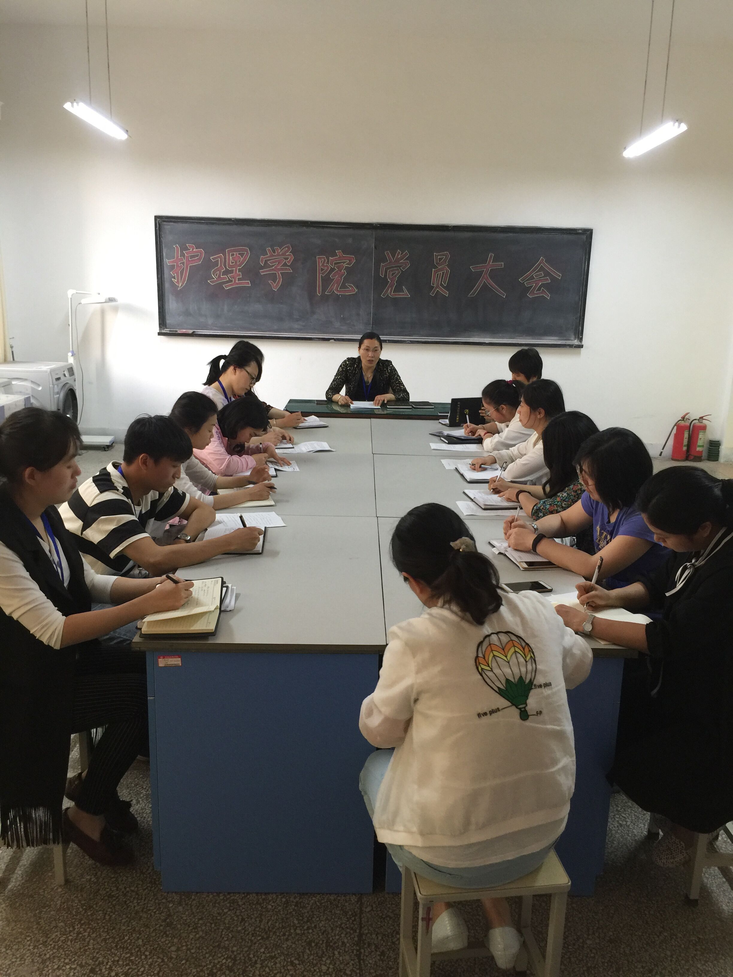 2017年5月9日下午,护理学院在D307召开党员大会,传达学校郭改英书记2017党建工作会议精神,对“两学一做”工作进行自查和签订党员承诺书。党总支书记徐娟主持会议,护理学院全体党员参加了会议。