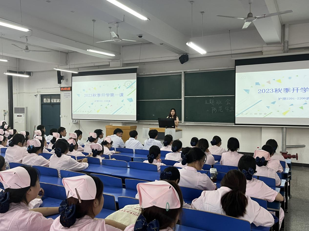淡云辞夏,新凉迎秋。为营造浓厚的开学氛围,引导我院学生以健康向上、充满活力的状态迎接新学期的到来,进一步加强大学生思想政治教育,筑牢安全意识,激励全体师生昂扬精神、锐意进取、奔向新征程,护理学院组织各班召开2023年“秋季开学第一课”主题班会,帮助同学们立心铸魂,系好新学期的“第一粒扣子”。