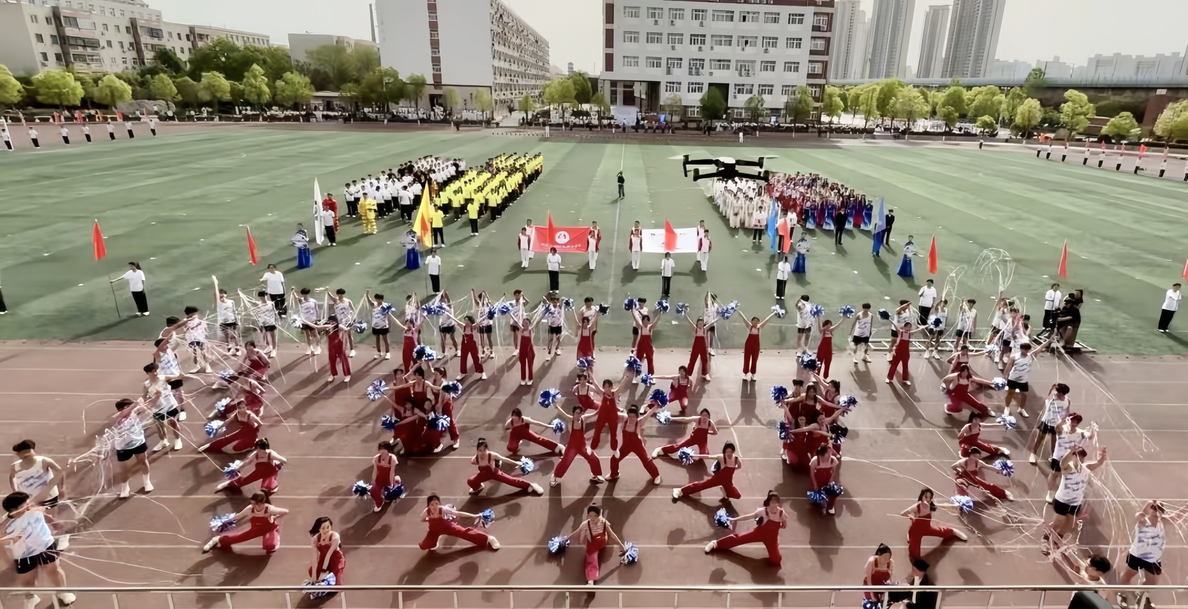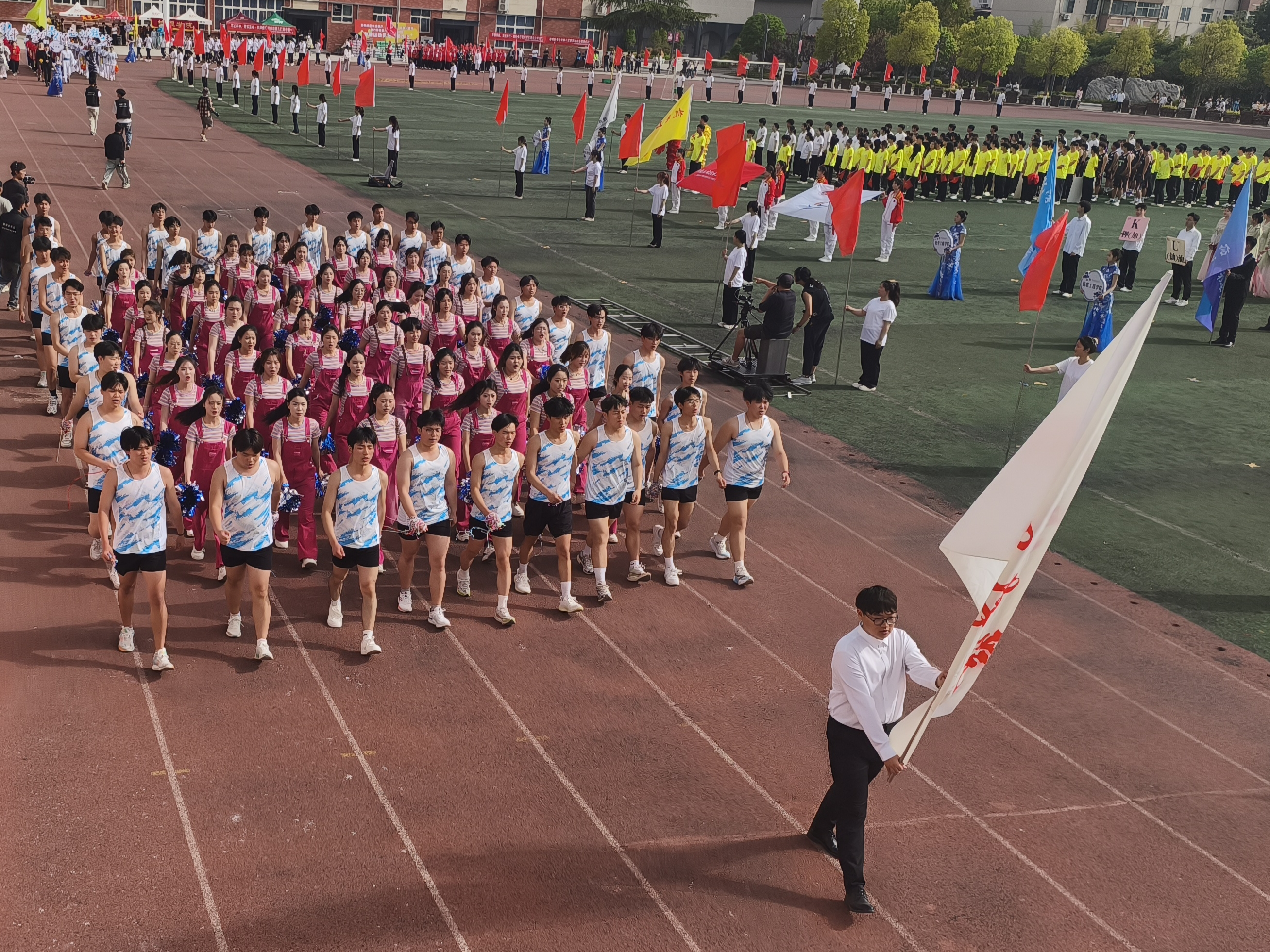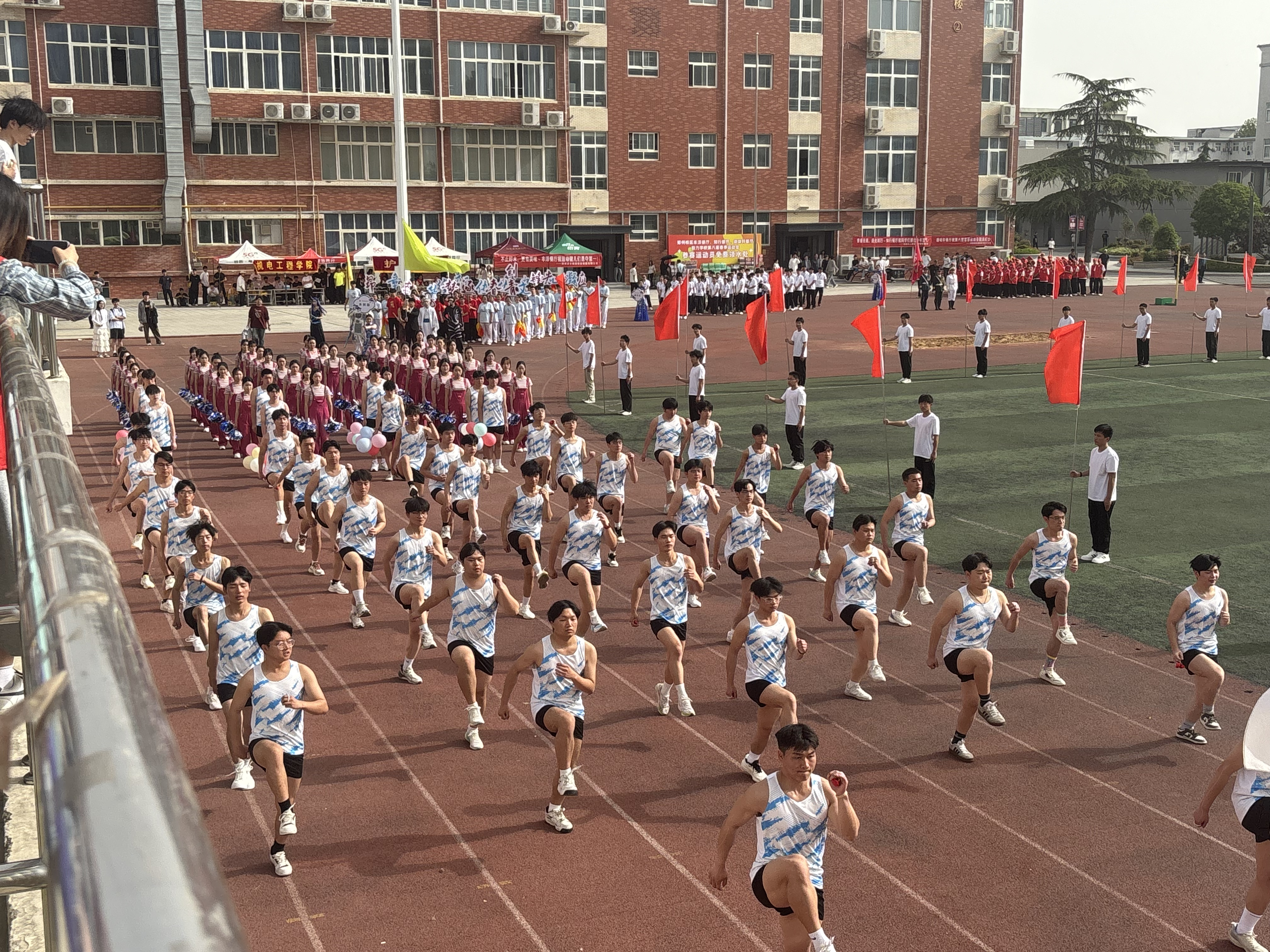 接着,46名手持花球的女生如春风般涌入跑道。她们步伐轻盈,笑容灿烂,随着节拍变换出整齐的队形,时而如花朵绽放,时而似波浪起伏,她们笑容灿烂,灵动的身姿随着音乐律动,手中彩球挥舞出绚丽的轨迹。她们用热情洋溢的舞蹈,传递着青春的活力与对生活的热爱,为运动会增添了一抹亮丽的色彩。