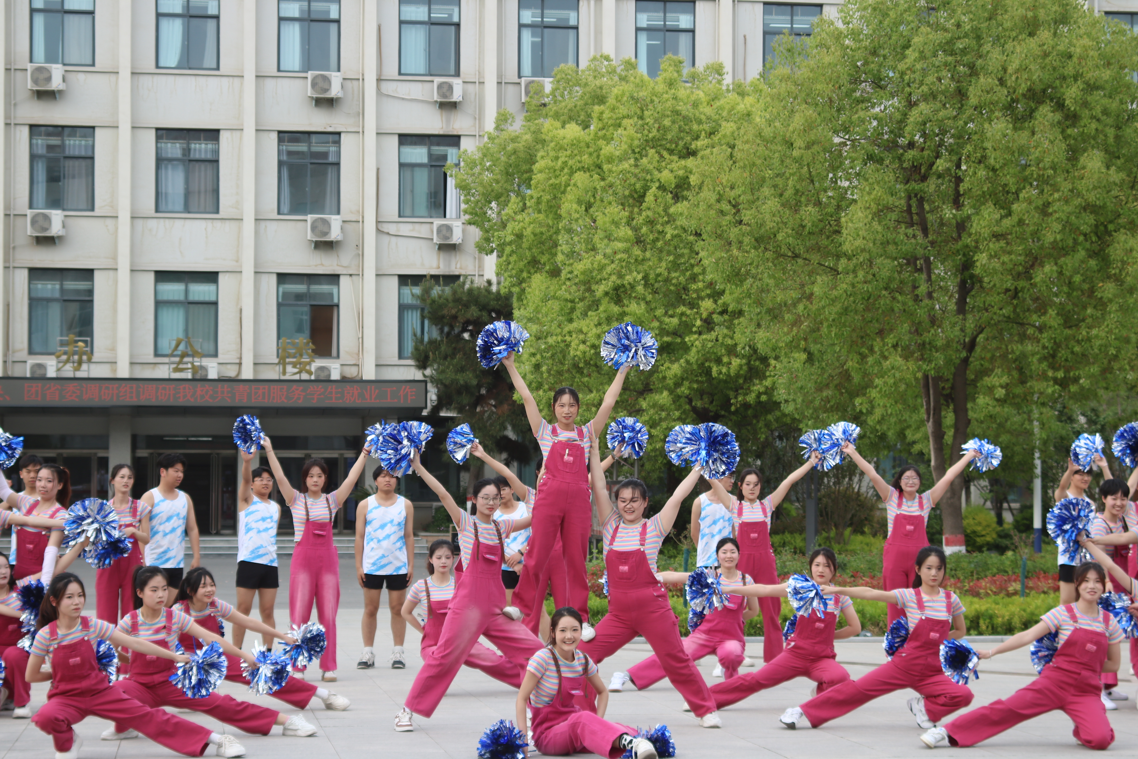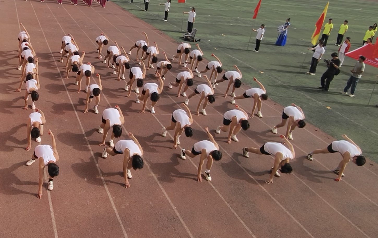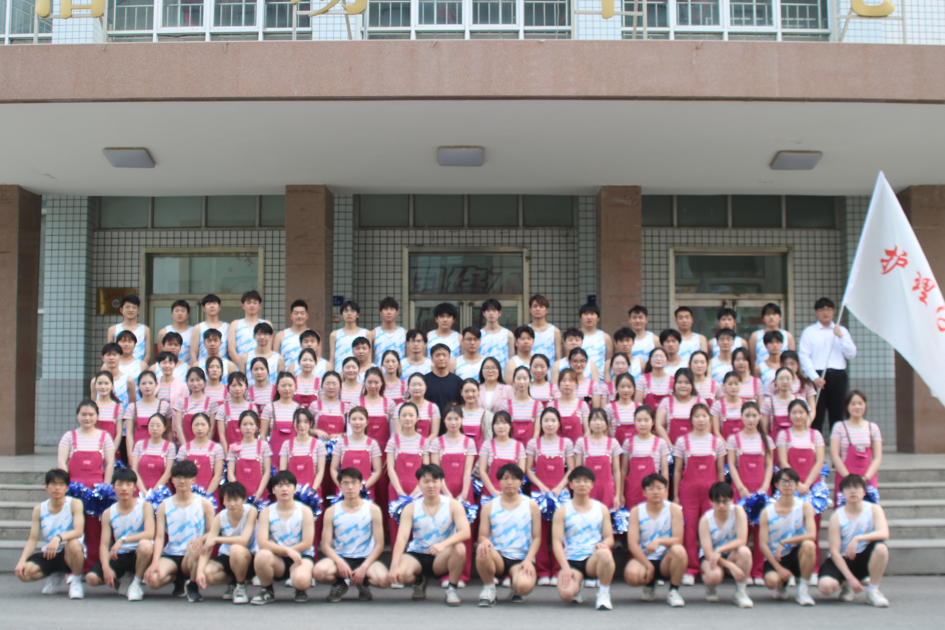接着,46名手持花球的女生如春风般涌入跑道。她们步伐轻盈,笑容灿烂,随着节拍变换出整齐的队形,时而如花朵绽放,时而似波浪起伏,她们笑容灿烂,灵动的身姿随着音乐律动,手中彩球挥舞出绚丽的轨迹。她们用热情洋溢的舞蹈,传递着青春的活力与对生活的热爱,为运动会增添了一抹亮丽的色彩。