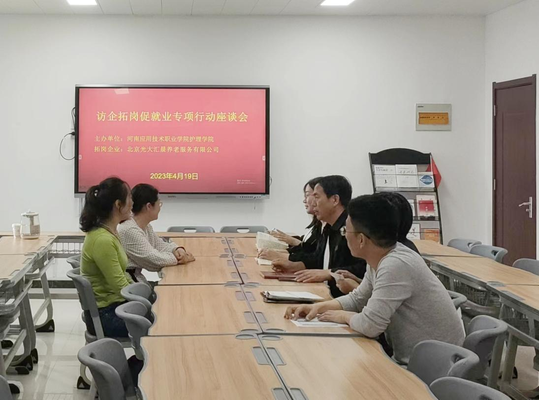 为更好促进老年保健与管理专业学生实习及就业,挖掘校企合作潜力,4月19日下午护理学院特邀北京光大汇晨养老服务有限公司人事处主任郭杰一行来院招聘,并在行政楼515针对访企拓岗促就业进行深入交流,护理学院党总支书记杨明杰、副院长温晓丽、党总支副书记景淼等人与会。